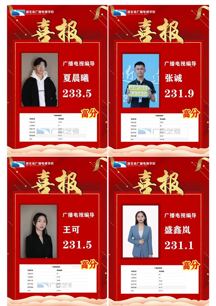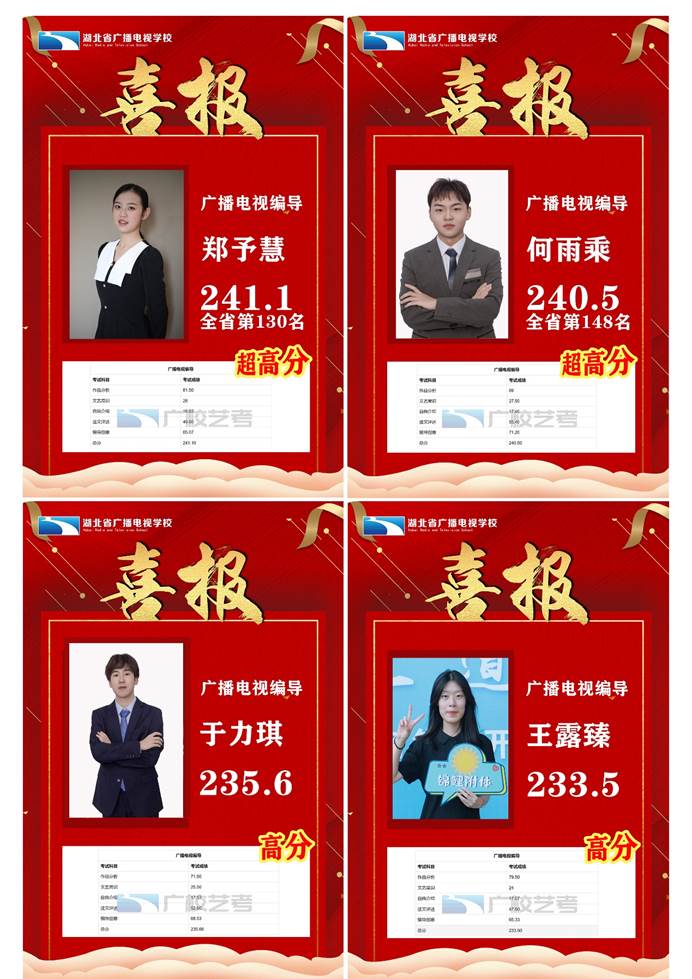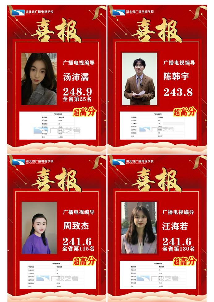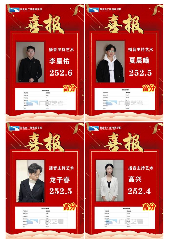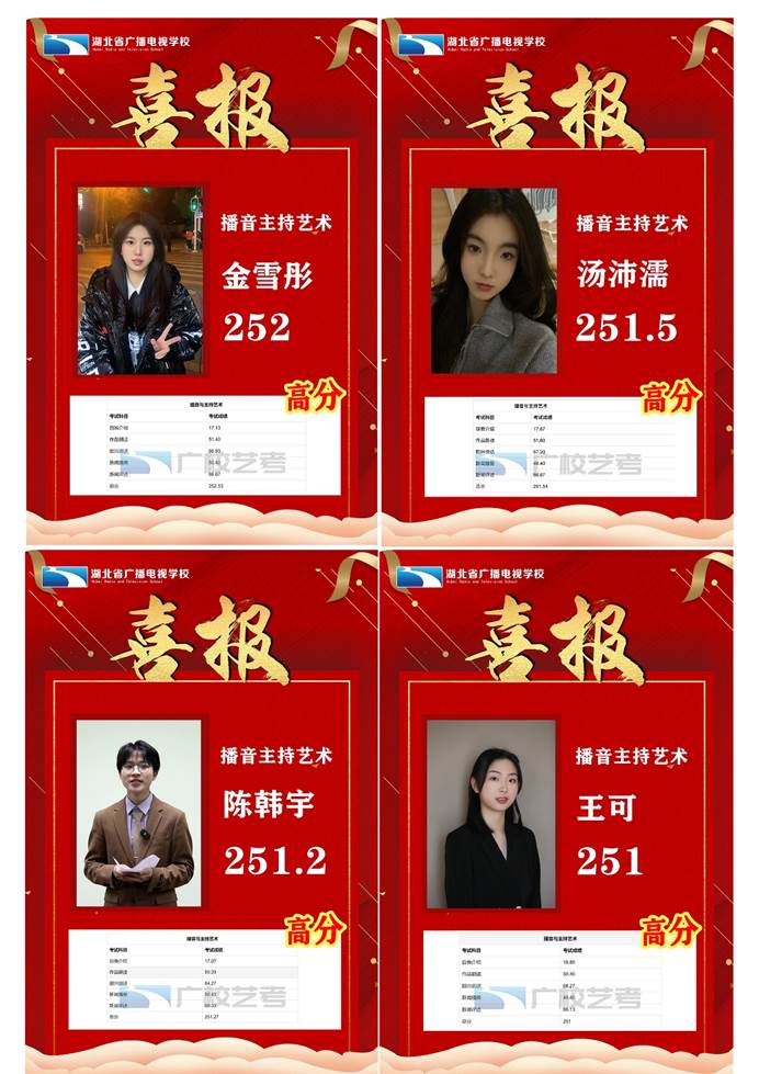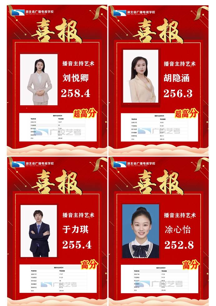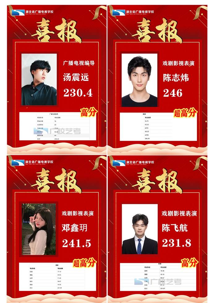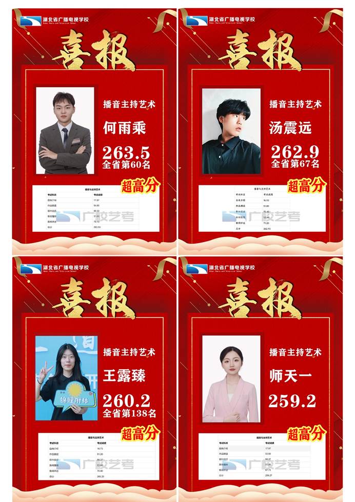 2023年湖北省艺术联考成绩已发布,我校在传媒类专业上取得了骄人成绩,喜报频传。据统计今年全省共有3000多名考生参加传媒类艺术联考,在我校师生和考生的不懈努力下,成绩斐然。播音专业全省排名百分之五以内有6人;编导专业全省排名百分之五以内有6人;表演专业排名全省百分之十以内有2人。整体成绩超高分占比高达26%,过线率92%,在传媒艺考培训的同行中名列前茅。其中何雨乘、汤震远播音专业全省排名60位、67位;汤沛儒、陈韩宇编导专业全省排名30位、80位;陈志炜、邓鑫悦排名100位、120位。