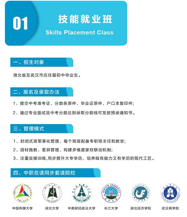 技能就业班:技能培养+学历提升,因材施教,三年内专业技能学习和大专学历同步完成,实现毕业即就业。